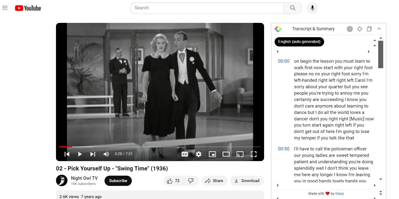 A secondary Glasp widget appears in conjunction with the transcript/summary