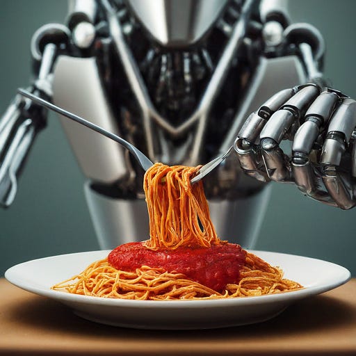 I made this image months ago using DALL-E 3 via Copilot; I have gotten so much mileage from it! The prompt was “create a photo-realistic image of a robot eating spaghetti.” This creation is a wonderful example of AI “getting it wrong.”