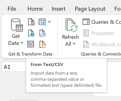Figure 1 The Text/CVS icon (in the upper left-hand corner) of the Get & Transform Data tab
